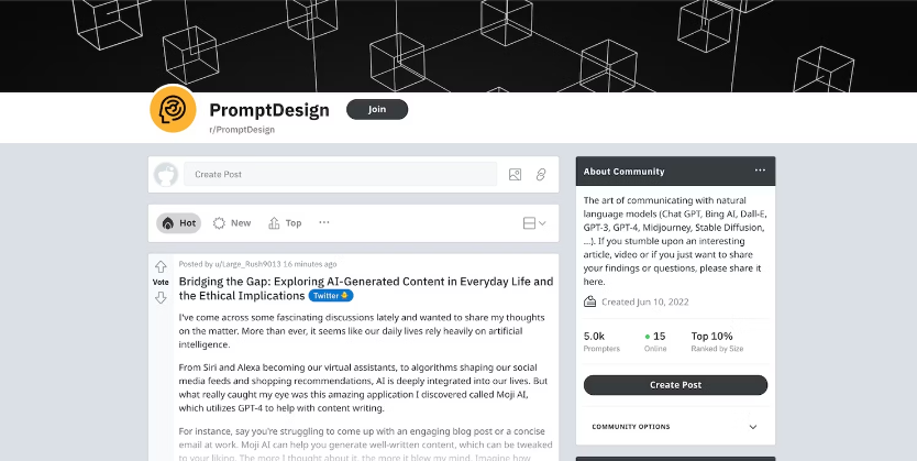 r/PromptDesign es un buen lugar para dominar la ingeniería rápida. En lugar de compartir indicaciones específicas del modelo, el grupo analiza las formas en que los usuarios se comunican con las herramientas de IA. Sus miembros prueban varias plataformas regularmente.