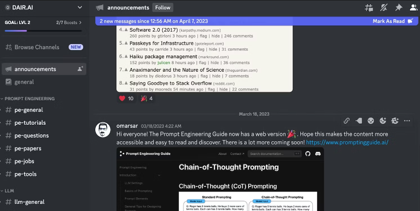 Además, explore el sitio web de DAIR.AI. De lo contrario, tendrá problemas para seguir las conversaciones: la mayoría de los miembros del servidor discuten sus recursos y repositorios de GitHub.
